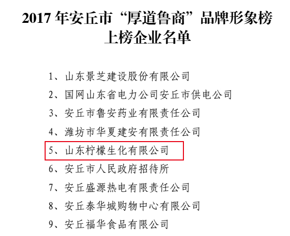 這次遴選,以“厚道魯商”品牌三級(jí)聯(lián)創(chuàng)信息系統(tǒng)為平臺(tái),經(jīng)過企業(yè)自主申報(bào)、職能部門逐級(jí)審核打分、媒體公示、安丘市“厚道魯商”倡樹行動(dòng)指導(dǎo)委員會(huì)成員單位一票否決、報(bào)濰坊市“厚道魯商”倡樹行動(dòng)指導(dǎo)委員會(huì)審核同意等程序,確定了山東檸檬生化有限公司等9家企業(yè)為2017年安丘市“厚道魯商”品牌形象榜上榜企業(yè)。